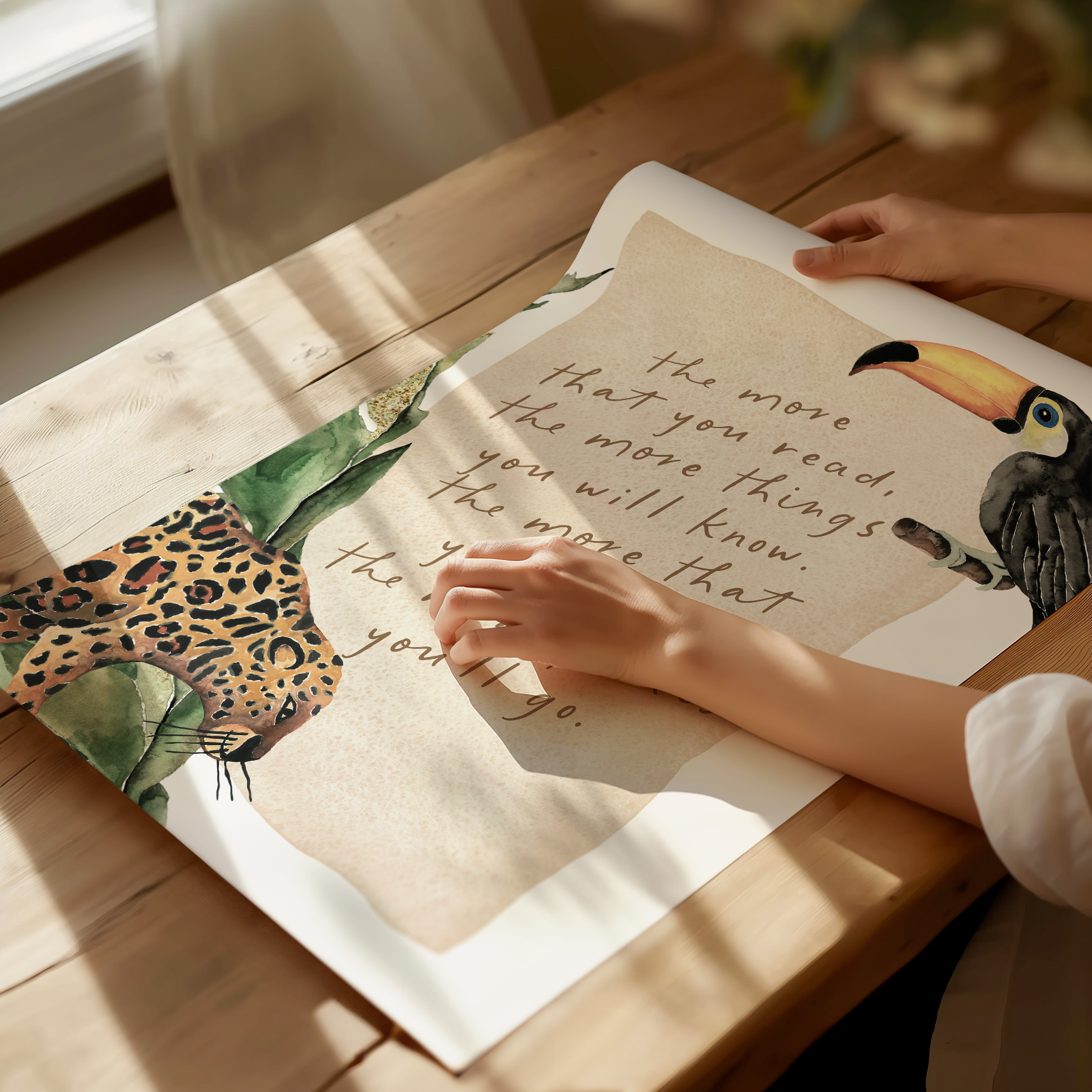 A framed poster can be with or without a mat. Frames with a mat offer a spatial effect between the frame and the print. This mat is usually a thick white matboard that sits in front of the picture, creating a visual space around it. No mat frames, known as a full-bleed framed print, mean no space between the frame and the print.